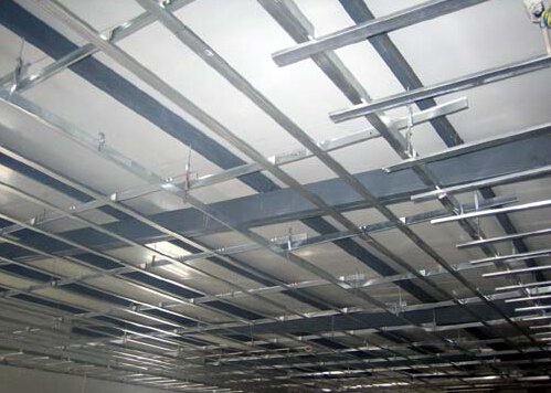 1、比試各個吊件的大小,將主龍骨卡在吊件上,截取所需要的尺寸,卡入后注意保持主龍骨之間平行。